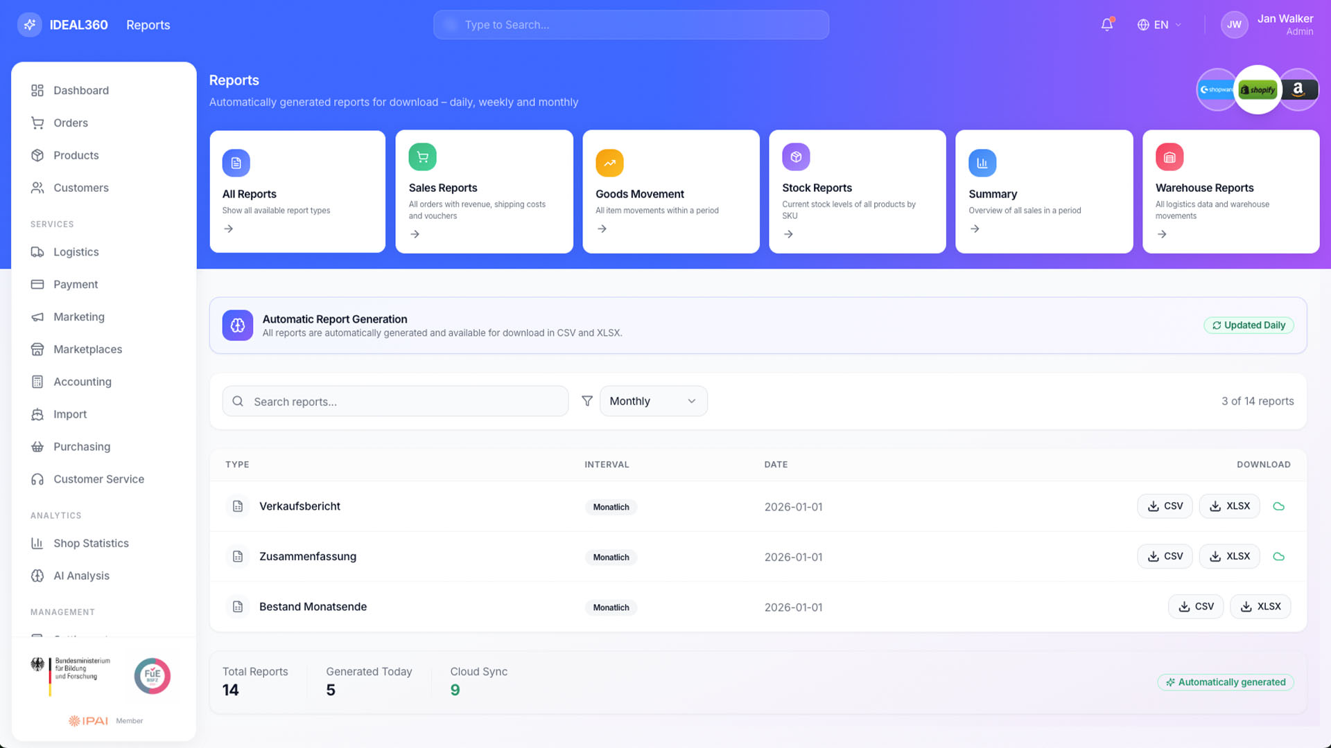 The reports module automates your entire reporting workflow. Sales, inventory, stock movement, and warehouse reports are generated daily, weekly, or monthly and provided as cloud synced CSV or XLSX files. All relevant metrics are available in a structured format for direct download, without manual aggregation or a separate reporting system.